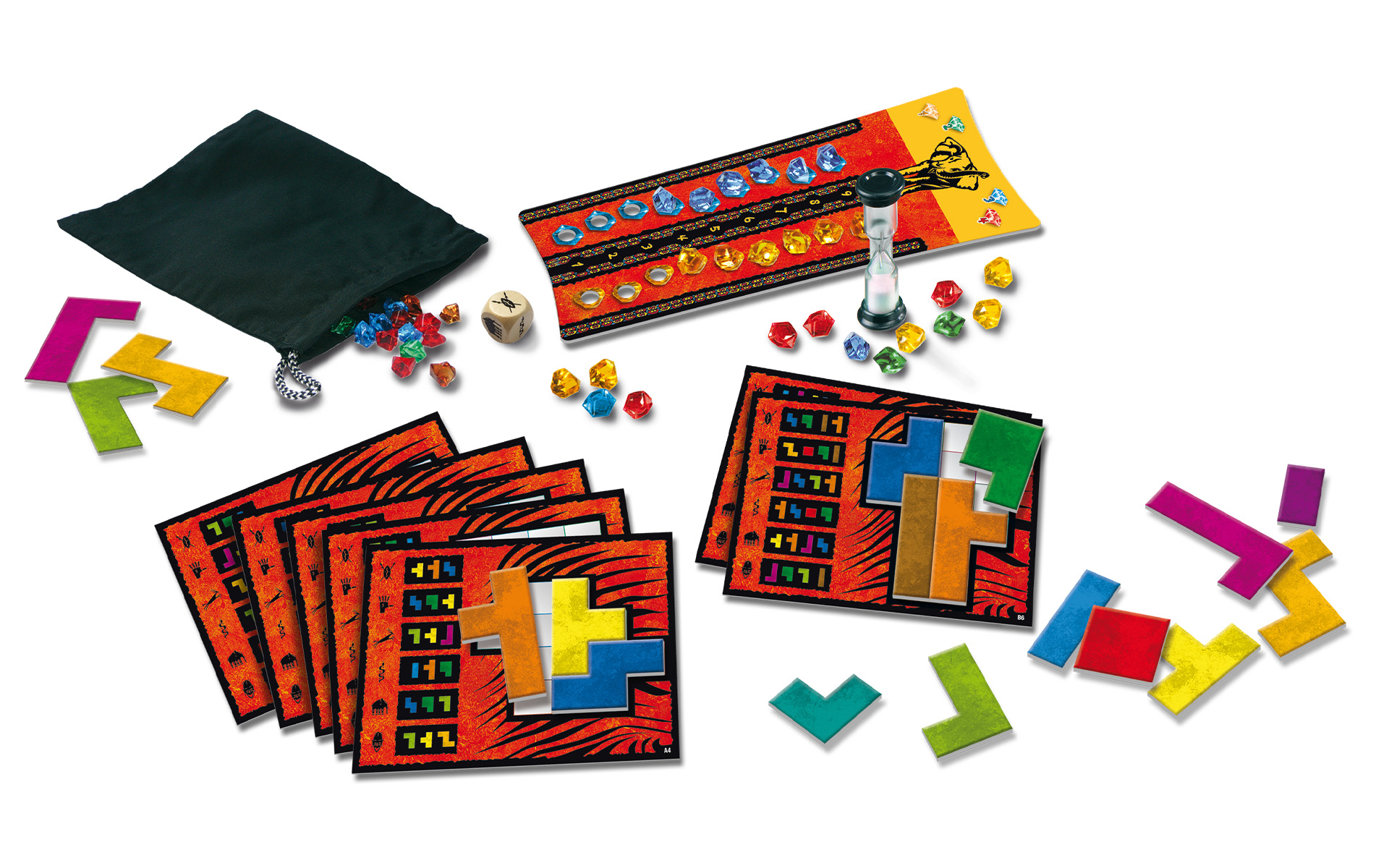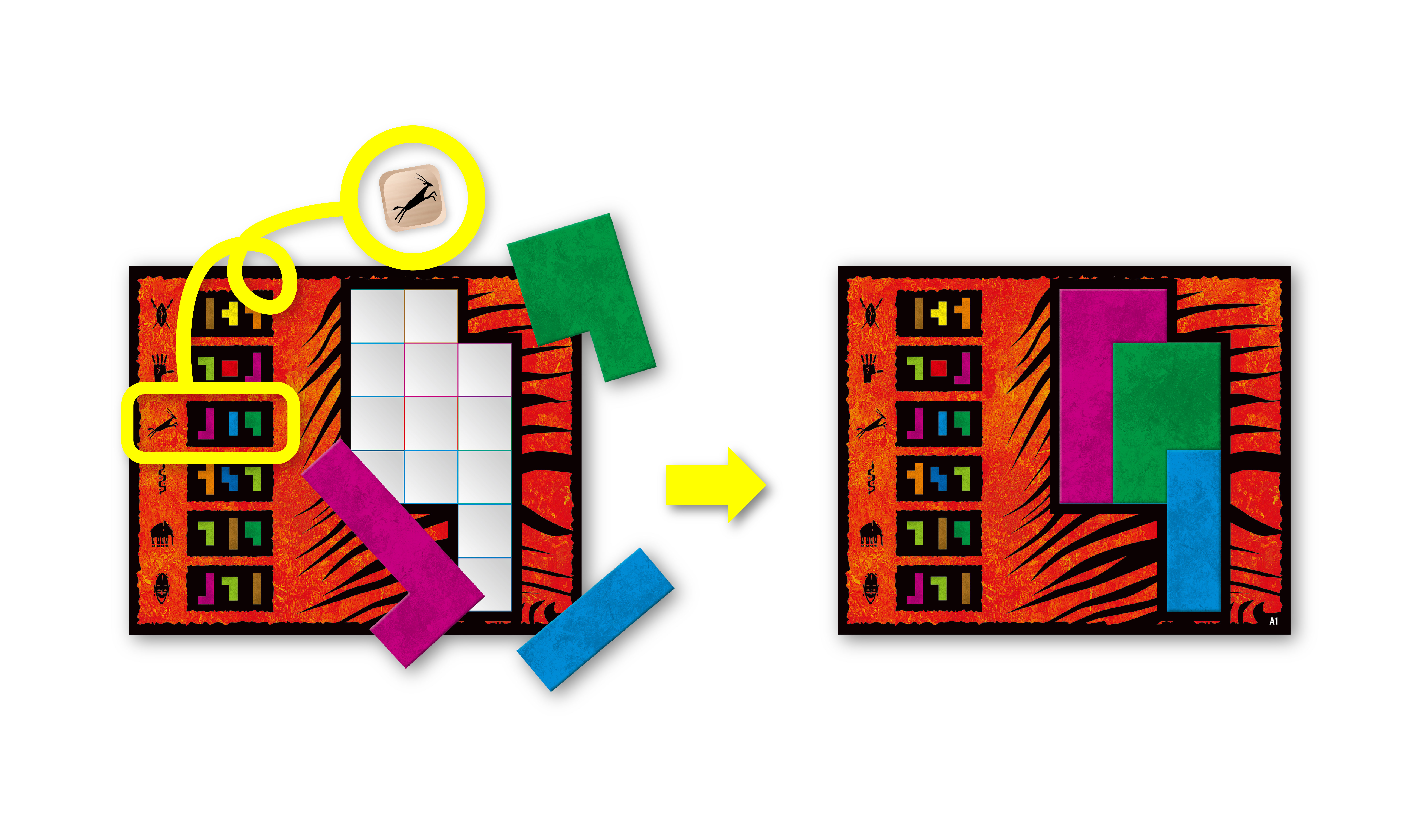 全員同時に、パズルボードに指示されたピースタイルを取り、ボードに書かれている枠にピースがピッタリおさまるように配置するゲームです。