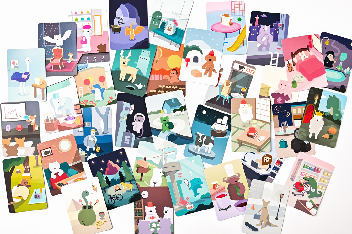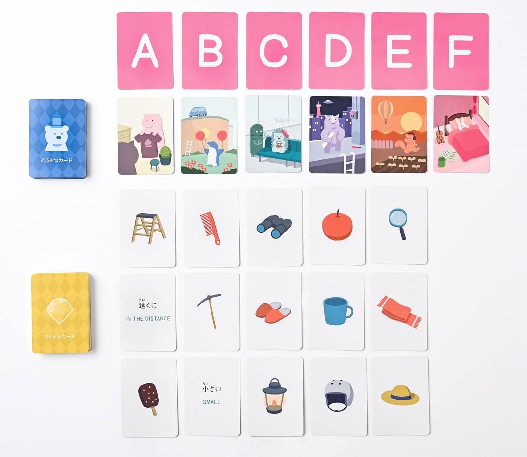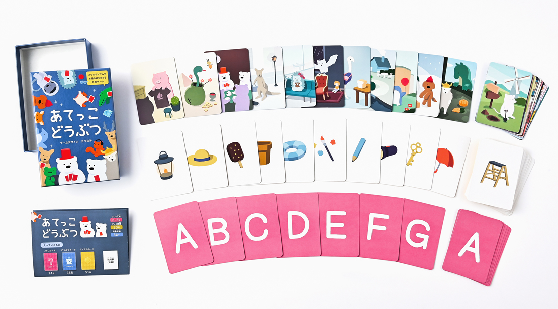 自分の「どうぶつカード」を、2枚の「アイテムカード」を使って、うまく他の人に伝えるゲームです。「どうぶつカード」に描かれたどうぶつや風景から連想できそうなカードを選びましょう。うまく伝わったら、当ててもらった人と、当てた人の両者の得点になります。最後に一番得点の多い人の勝ちです。