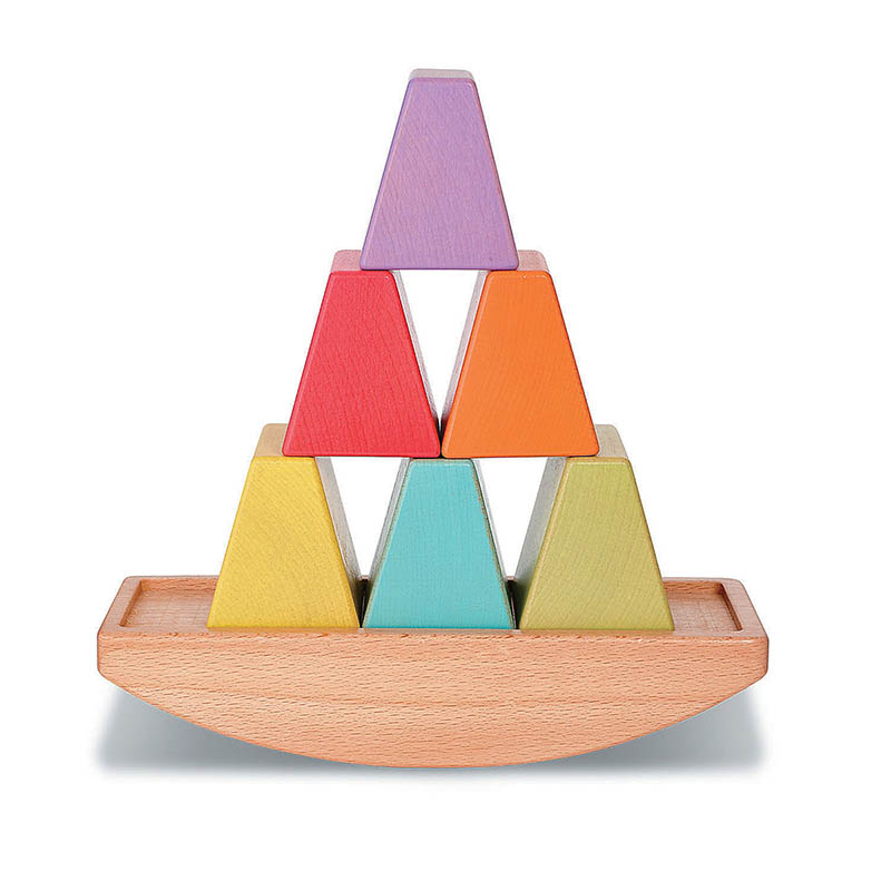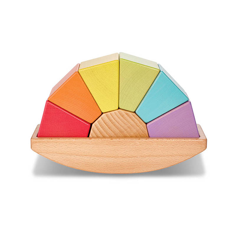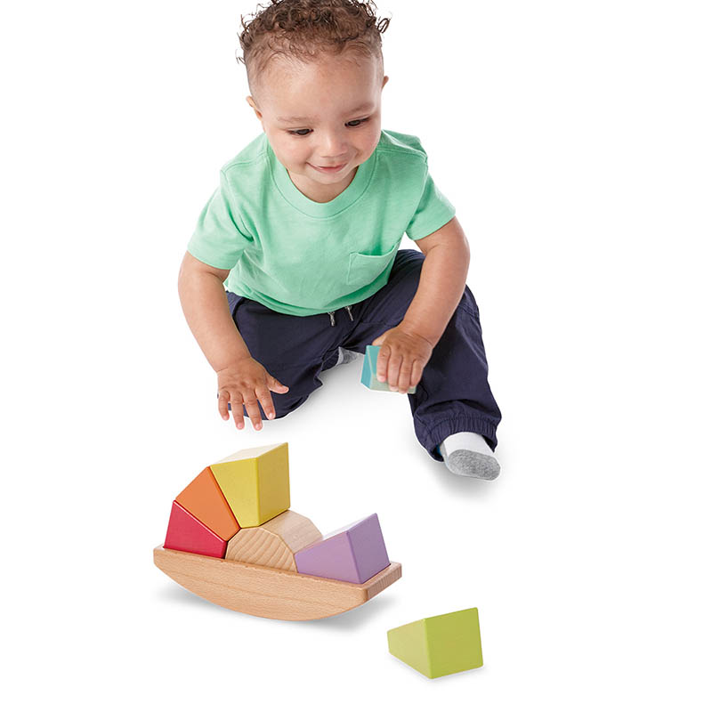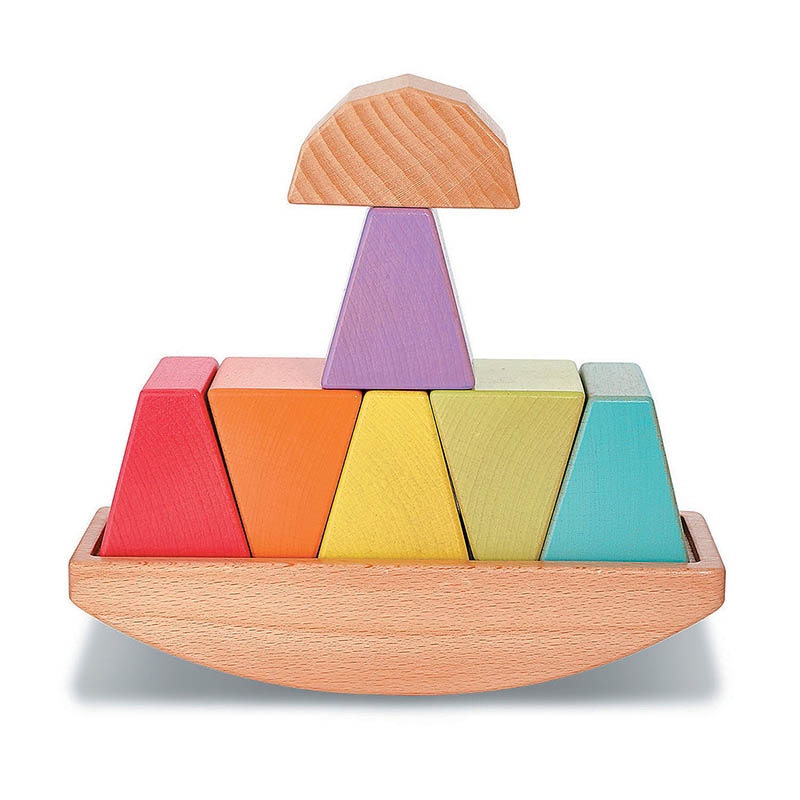 babu Rocker は、シーソーのようにゆらゆら動くロッキングベースに積み木をのせて遊ぶおもちゃです。