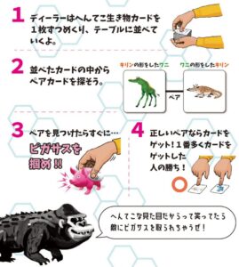 ①ディーラーはヘンテコ生き物カードを1枚ずつめくり、テーブルに並べていきます。 ②並べたカードの中からペアを探します。 ③ペアを見つけたらすぐにピガサスをつかみます。 ④正しいペアならカードをゲット!1番多くカードをゲットした人の勝ち!