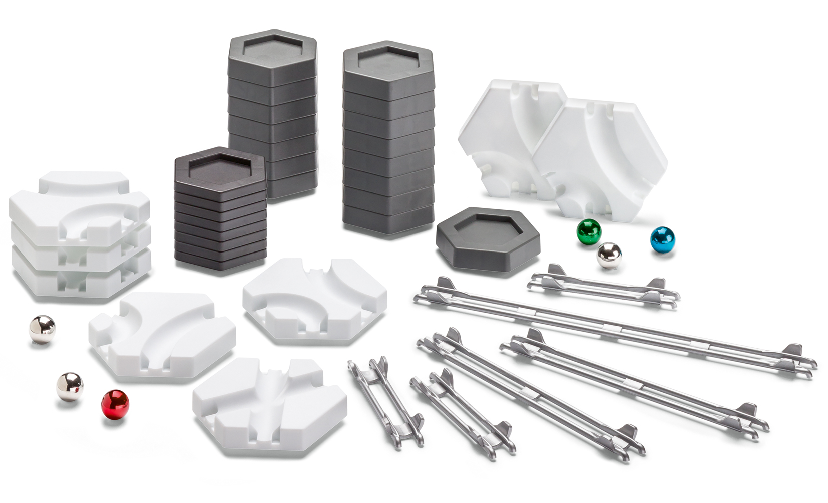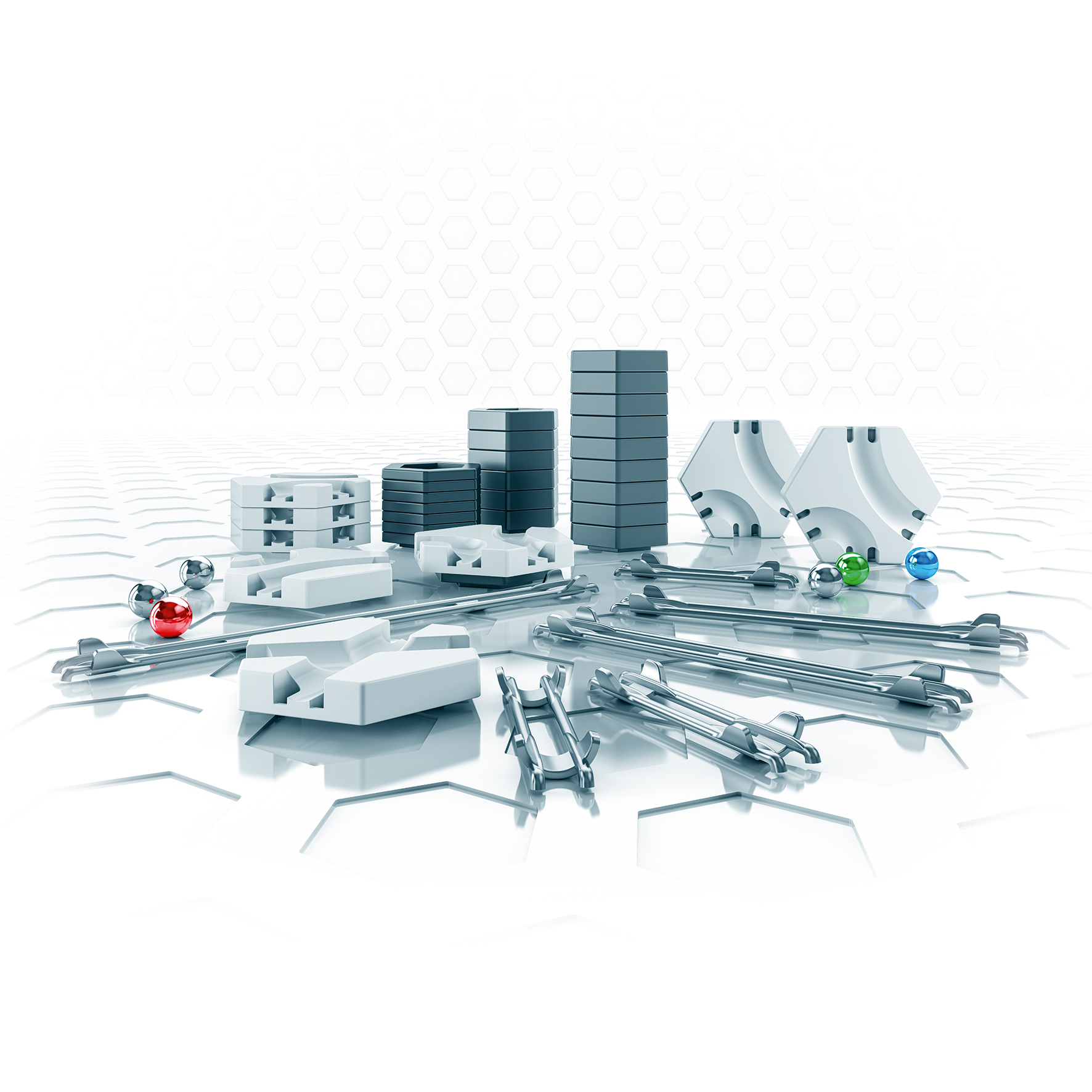 高さのあるコースを作ることができる、柱タイルがメインのセットです。このセットを使えばボールの走りをまったく新しいレベルへ進めることができます。スターターセットに、大小の柱やカーブプタイル、トラックを組み合わせれば、さらにアクションとスリル満点の走りが楽しめます。