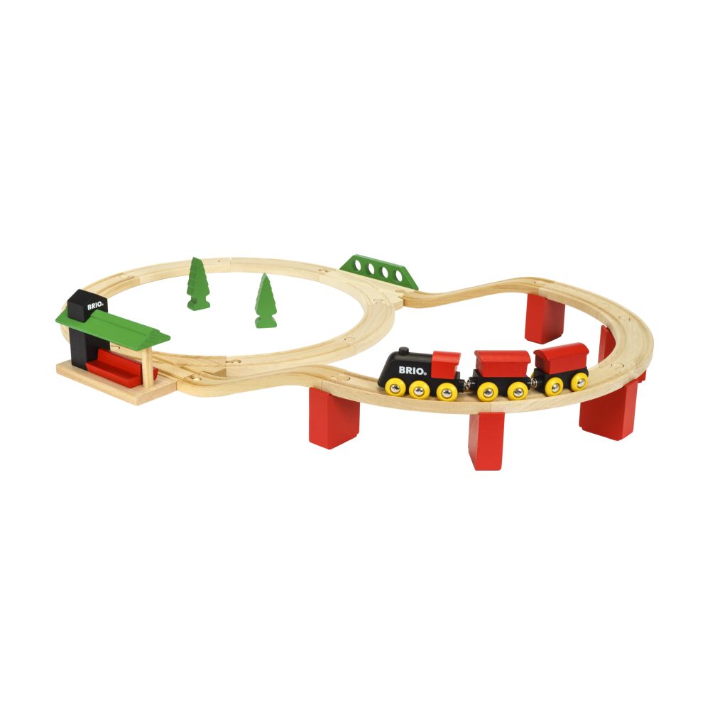 クラッシックな木製トレインにモダンなレイアウトのセットです。駅舎もあり、起伏に富んだレイアウトです。