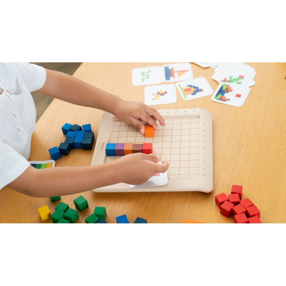 数え上げ、分類、カラーの順序の練習になります。100個のブロックと24枚のプレイカードを使って、遊びの幅も広がります。他のユニットリンクシリーズと併せて遊べます。