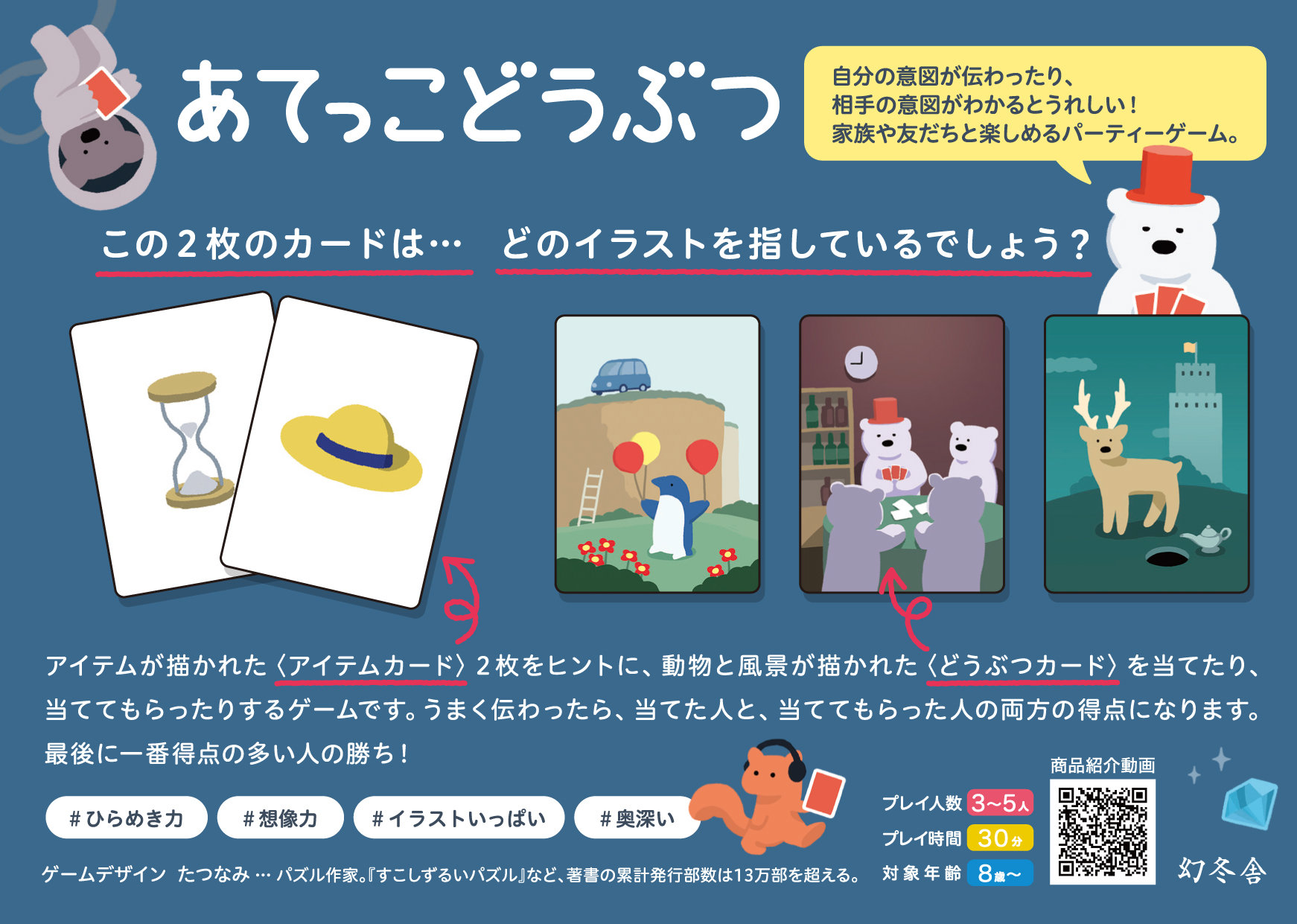 自分の「どうぶつカード」を、2枚の「アイテムカード」を使って、うまく他の人に伝えるゲームです。「どうぶつカード」に描かれたどうぶつや風景から連想できそうなカードを選びましょう。うまく伝わったら、当ててもらった人と、当てた人の両者の得点になります。最後に一番得点の多い人の勝ちです。