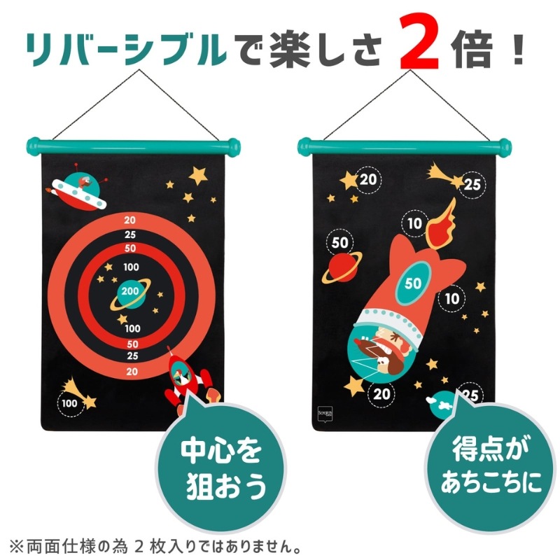 リバーシブルで2面のボードが楽しめるマグネットタイプのソフトダーツボードと6本の矢がセットになったダーツセット。ダーツボードはマグネットタイプなので、壁を傷つける心配もありません。筒形のかわいいケースに入ったダーツセットは、使わない時はクルクルと巻いて収納も簡単。宇宙をイメージしたおしゃれなダーツボードは、子供部屋のインテリアとして貼りっぱなしでもGood!
