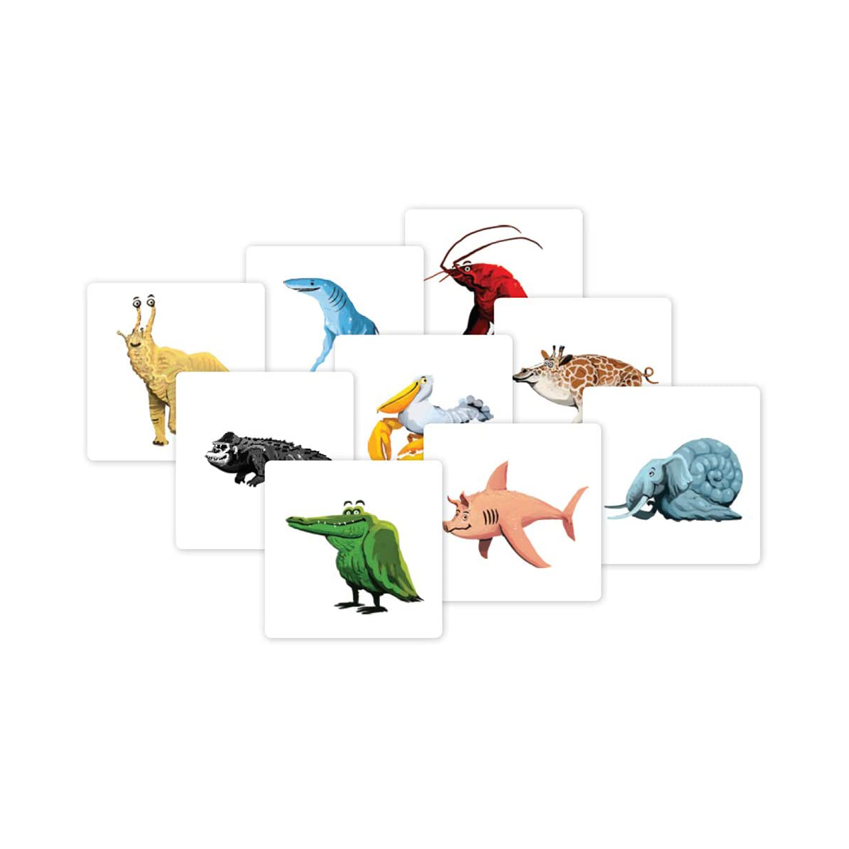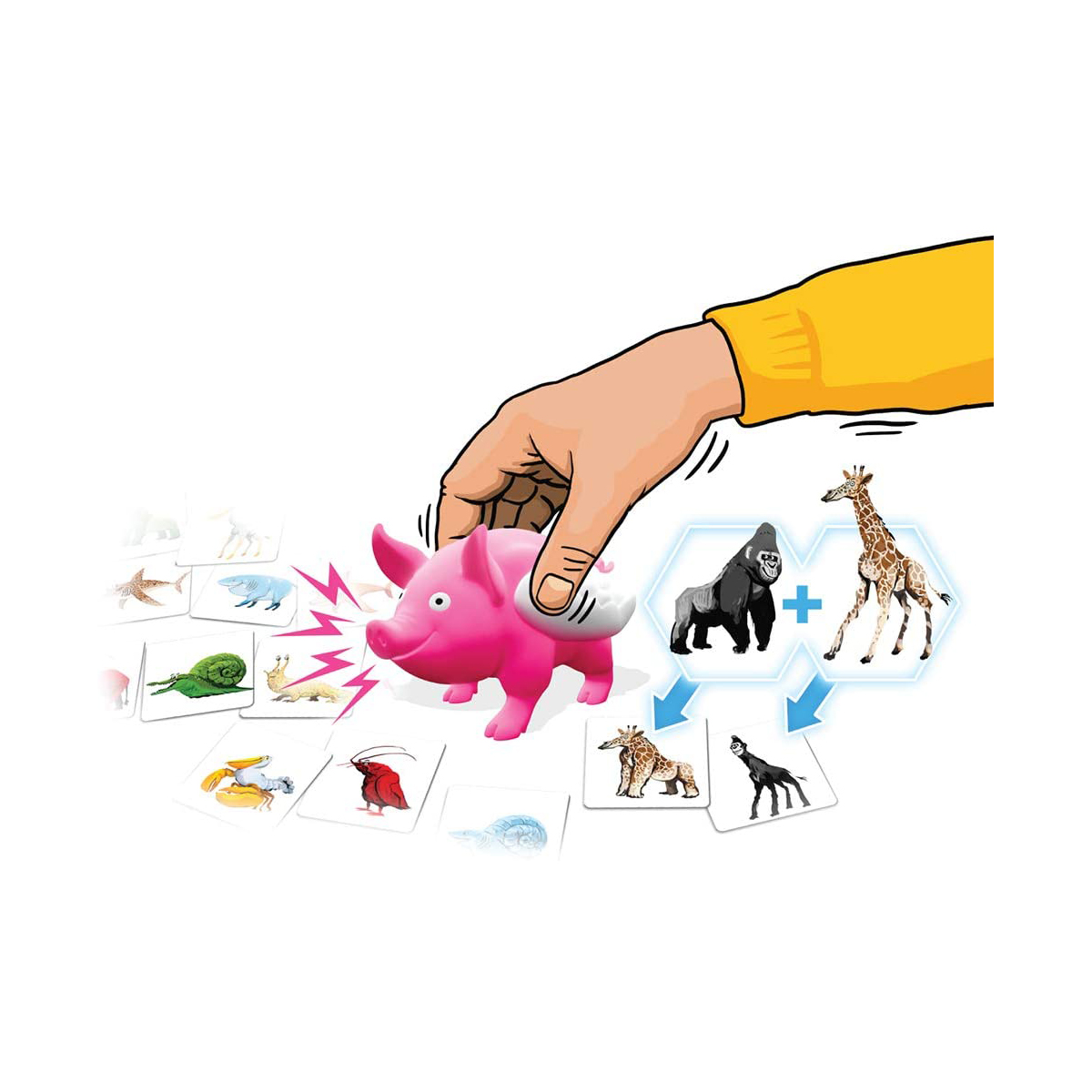 ①ディーラーはヘンテコ生き物カードを1枚ずつめくり、テーブルに並べていきます。 ②並べたカードの中からペアを探します。 ③ペアを見つけたらすぐにピガサスをつかみます。 ④正しいペアならカードをゲット!1番多くカードをゲットした人の勝ち!