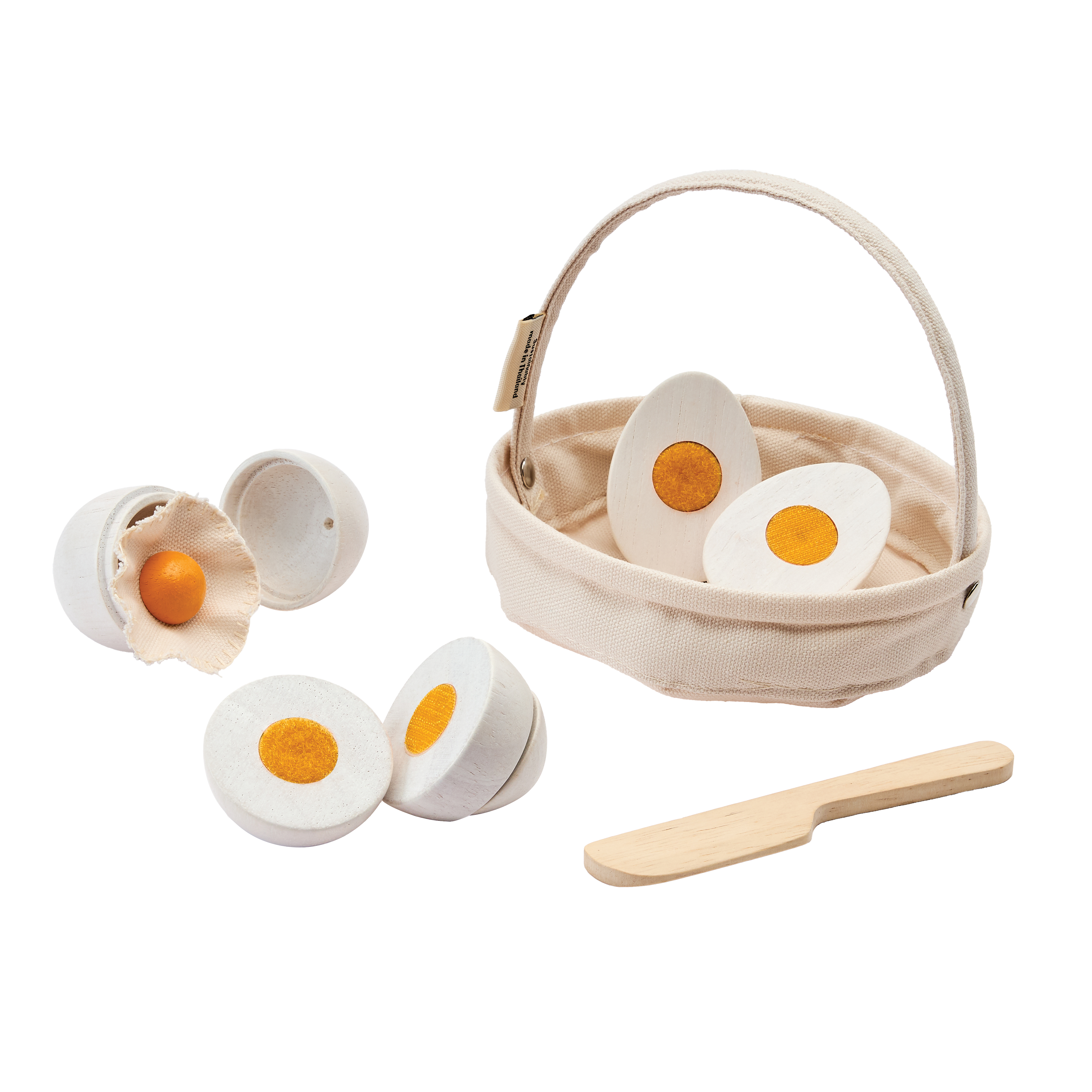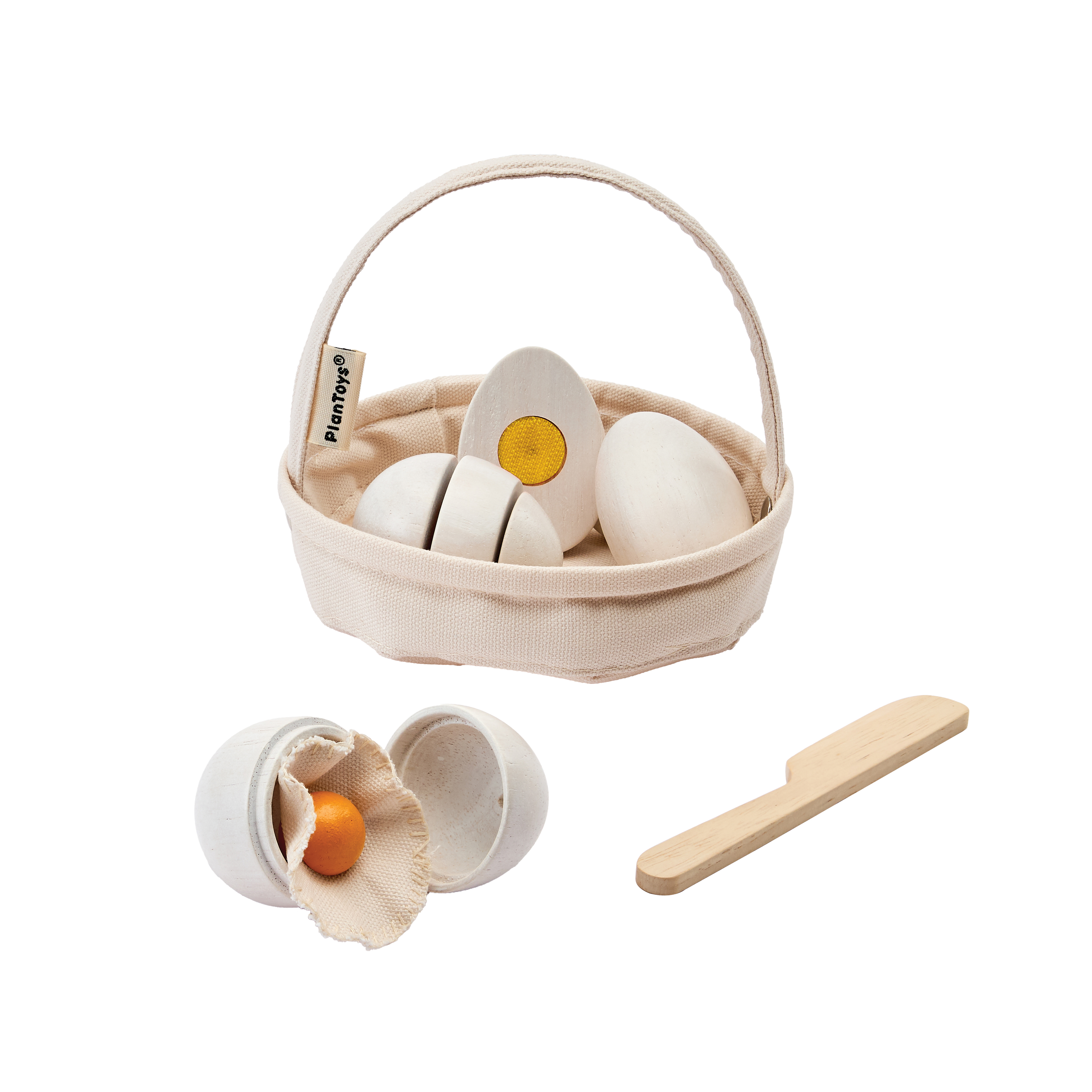 セット内容:全5点(布製バスケット1個、木製の卵3個[割れる生卵とゆで卵]、木製ナイフ1本)【対象年齢】3歳以上
